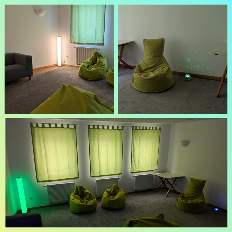 Ab sofort gibt es in der Schule einen Ruhe-Raum, der sowohl im morgendlichen Schulbetrieb als auch im Nachmittagsbereich genutzt werden kann. Es dürfen sich bis zu 6 Kinder in Begleitung einer Betreuungsperson darin aufhalten, um zur Ruhe zu kommen und sich zu entspannen.